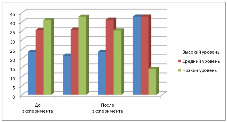 Так, до начала эксперимента низкий уровень сыормированности экологической культуры младших школьников экспериментальной группы показали 42,8%, средний – 35,7%, высокий – 21,5% учащихся. После внедрения методического комплекса, направленного на формирование экологической культуры учащихся, показатели уровня сформированности экологической культуры младших школьников изменились: низкий уровень показали 14,2% учащихся экспериментальной группы, средний – 42,9%, высокий – 42,9%, что говорит о его эффективности.