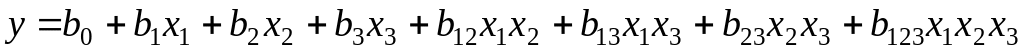 Обработка результатов эксперимента позволяет получить математическую модель изучаемого процесса (объекта) в виде уравнения регрессии, например для трехфакторного эксперимента: