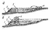 Укладка (намыв) грунта происходит в результате оседания частиц грунта из пульпы, когда скорость движения ее становится ниже критической величины. Используя бульдозеры, площадь намыва ограждают по периметру грунтовыми валками, создавая так называемую "карту намыва", и заполняют ее пульпой. Скорость движения пульпы в карте падает практически до нуля, грунт осаждается, осветленная вода через водосборные колодцы, предварительно устроенные в карте, сбрасывается за пределы участка намыва. Различают безэстакадный и эстакадный способы намыва (рис3).