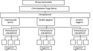 Один з головних напрямів удосконалення організаційної структури — це створення регіональних управлінь, що мають значні повноваження під час проведення операцій і контролю. Нижній рівнянь це широка мережа відділень банку, що спеціалізуються на наданні всього спектра найсучасніших банківських послуг. При цьому досягається підвищення самостійності відділень, їхньої відповідальності й ініціативності. Триступенева організаційна структура сучасного банку зображена на рис. 9.3.