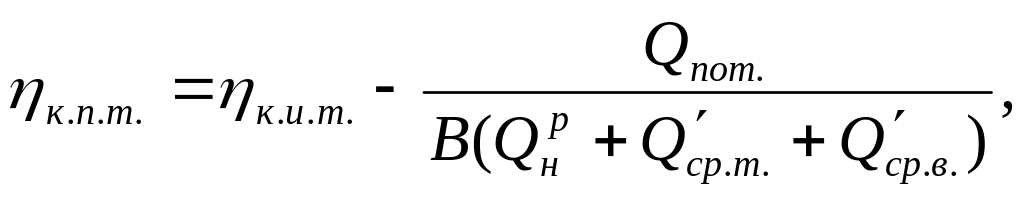 тепловые потери (в сумме) от механического недожога, через кладку (теплопроводностью и аккумуляцией), излучением через отверстия, с охлаждающей водой Qпот.