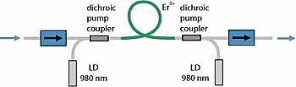 Схема простого легированного эрбием волоконного усилителя (EDFA) показана на рис 8. Основная составляющая усилителя - легированное ионами эрбием оптоволокно, которое, как правило, является одномодовым волокном. В показанной на рис.8 схеме активное волокно накачивается светом двух лазерных диодов (двунаправленная накачка), хотя однонаправленная накачка в прямом или обратном направлении (cонаправленная и противонаправленная накачка) также очень распространены. Накачка производится, как правило, на длине волны приблизительно 980 нм и иногда на 1450 нм.