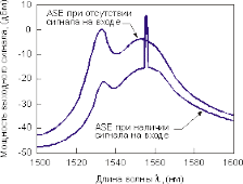 В отсутствии входного сигнала EDFA является источником спонтанного излучения фотонов. Спектр излучения зависит от формы энергетической зоны атомов эрбия и от статистического распределения заселенностей уровней зоны. Спонтанно образованные фотоны, распространяясь по волокну в активной зоне усилителя EDFA, тиражируются, в результате чего создаются вторичные фотоны на той же длине волны, с той же фазой, поляризацией и направлением распространения. Результирующий спектр спонтанных фотонов называется усиленным спонтанным излучением. Его мощность нормируется в расчете на 1 Гц и имеет размерность Вт/Гц.
