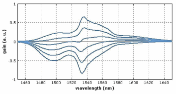 Форма спектра усиления эрбия зависит от сечений поглощения и излучения, которые зависят от стекла матрицы. Кроме того, спектральная форма усиления, и не только ее величина, существенно зависит от средней степени возбуждения ионов эрбия, поскольку генерация осуществляется по "квази-трехуровневый" переход. На Рис. 10 показан спектр усиления для наиболее распространенного типа стекла, который является некоторой разновидностью кварца с дополнительными примесями, например, чтобы избежать кластеризации ионов эрбия. В других стеклах спектр может существенно отличаться.