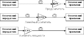 Линейные усилители устанавливаются в промежуточных точках протяженных линий связи между регенераторами или на выходе оптических разветвителей с целью компенсации ослабления сигнала, которое происходит из-за затухания в оптическом волокне или из-за разветвления в оптических разветвителях, ответвителях, мультиплексорах WDM. Линейные усилители заменяют оптоэлектронные повторители и регенераторы в тех случаях, когда нет необходимости в точном восстановлении сигнала.