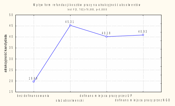Stopień atrakcyjności przypisywany absolwentom bez wsparcia wynoszący tylko 20 pkt. rośnie aż do 45pkt. gdy absolwent uzyskuje wsparcie w postaci refundacji kosztów pracy. Jest to jedna z największych różnic jakie udało się nam odkryć podczas tych badań (p<0,0000).