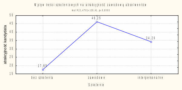 Szkolenia dla pracowników można podzielić na dwie grupy tematyczne: szkolenia zawodowe dające wiedzę i umiejętności profesjonalne (obsługi maszyn, procedur itd.) oraz szkolenia w zakresie wiedzy i umiejętności interpersonalnych (np. komunikacja, praca w zespole itp.). W zależności od treści szkolenia, w różnym stopniu, wpływają one na ocenę atrakcyjności zawodowej kandydatów. Analiza wariancji ocen kandydatów po różnych szkoleniach pokazuje, że szkolenia zawodowe znacząco silniej podnoszą atrakcyjność zawodową niż szkolenia umiejętności interpersonalnych (p<0,000), co można zauważyć na rysunku 8.