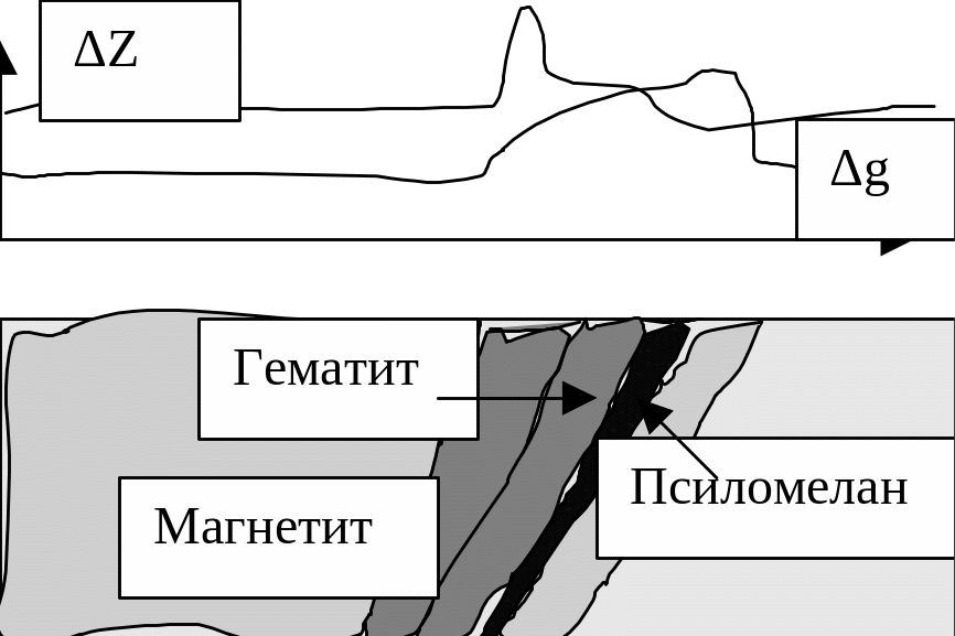 Характерны комплексные магнитные и гравитационные аномалии залежей оксидных марганцевых и железных магнетит-гематитовых руд.