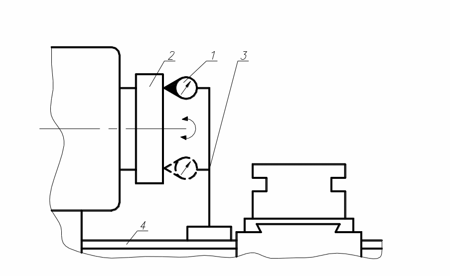 1 – индикатор, 2 – шпиндель, 3 – индикаторная стойка, 4 – направляющие станины