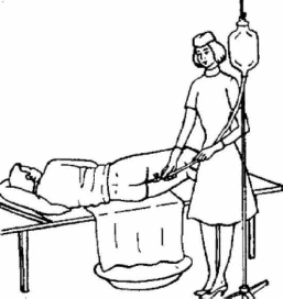 1.Смазать наконечник вазелином. 2. Развести двумя пальцами левой руки ягодицы больного. 3. Легкими вращающими движениями ввести наконечник в задний проход больного, направляя его вначале в направлении пупка на глубину 4 см, а потом параллельно копчика на глубину 10-12 см. 4. Открыть кран и медленно влить до 1,5 л воды. 5. Закрыть кран и вывести наконечник из прямой кишки. 6.Попросить больного удерживать воду на протяжении 10 мин. 7. Снять с резиновой трубки наконечник, промыть его с мылом, продезинфицировать в 1% растворе хлорамина в течение 30 мин. |