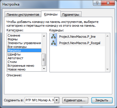 Для цього викликаю контекстне меню, пункт «Настройки». У вікні «Настройки» викликаю закладку «Команды». У списку «Категории» обираю пункт «Макросы». Створені макроси з’являються в панелі команди і починаються зі слова Project. За допомогою миші перетаскуємо необхідні макроси у власну панель інструментів. (Рис 1.4)