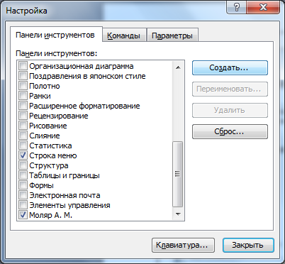 Створюю власну панель інструментів з ім’ям «Настраиваемая 1 ». Для цього викликаю контекстне меню, пункт «Настройки», обираю закладку «Панель инструментов», натискаю клавішу «Создать». У полі вводу «Панель инструментов» надаю им’я «Моляр А. М.». У полі вводу «Сделать панель доступной для:» вказується файл «РГР № 1 Моляр А. М.». (Рис. 1.2)