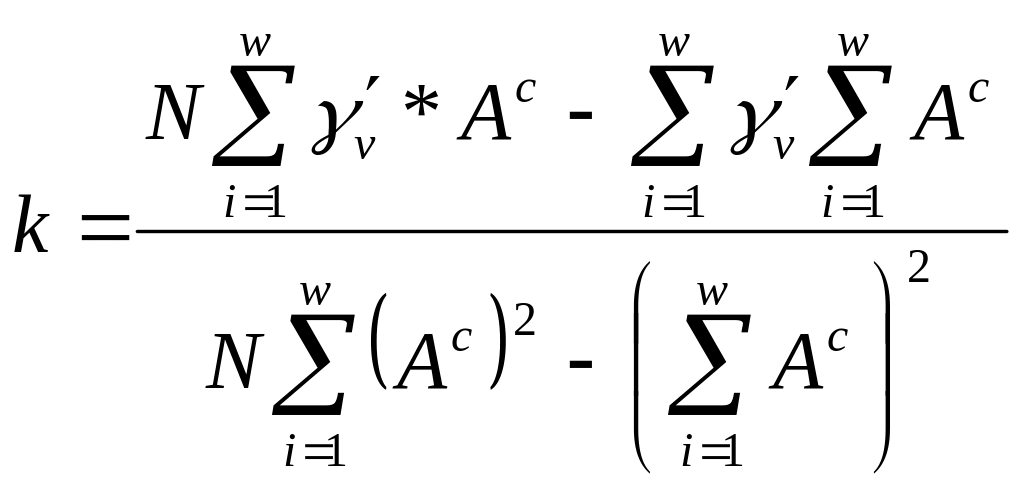 5) по полученным объёмным весам вычисляются средние значения γ0 и k по способу наименьших квадратов, исходя из условия, что объёмный вес угля и его зольность связаны прямолинейной зависимостью вида уравнения (2.6).