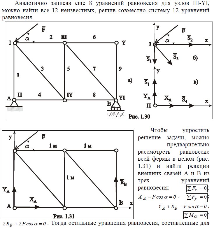 Расчет ферм заключается в определении реакций внешних связей (опорных узлов) и усилий в стержнях. Стержни фермы обычно заранее считают растянутыми, тогда положительным усилиям соответствуют растянутые стрежни, отрицательным – сжатые. Стержни фермы нумеруют арабскими цифрами, узлы – римскими цифрами