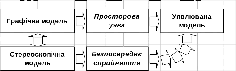 Рис. 2. Схема процесу створення графічної моделі по заданій фізичній із частковим заміщенням просторової уяви безпосереднім сприйняттям стереоскопічного зображення (пряма задача)