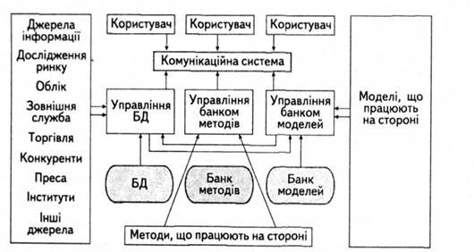 • банк моделей — об'єднує кількісні моделі маркетингу, призначені для підтримки прийняття рішень;