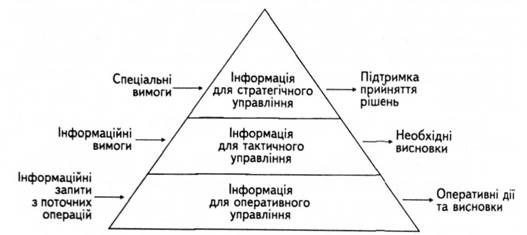Представлена інформаційна піраміда (рис. 73) відображає інформативність (конкретність, рівень агрегування) даних і характеризує ступінь задоволення потреб різних рівнів управління системи управління.