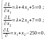 Знайдемо частинні похідні функції Лагранжа за змінними х1, х2 і λ та прирівняємо їх до 0: