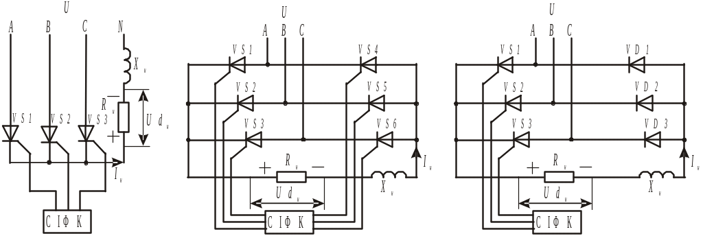 Основним недоліком однофазних керованих випрямлячів є ду-же великий коефіцієнт пульсацій і навантаження однієї фази, тому більш ефективними є трифазні керовані випрямлячі, які забезпе-чують рівномірне навантаження струмом фаз мережі живлення, зменшення в десятки разів коефіцієнта пульсацій випрямленої нап-руги і струму, збільшення частоти пульсацій.