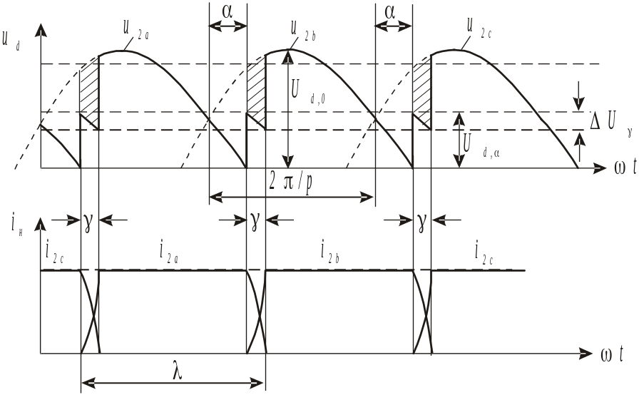 Рис.31. Часові діаграми напруг і струмів з врахуванням комутації тиристорів
