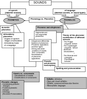 Phonology vs. Phonetics. While phonetics studies material, or physical, sounds of speech, phonology studies sound types, or abstract sounds of language. Phonology highlights the functions of sound types, i.e. their ability to differentiate between meanings.