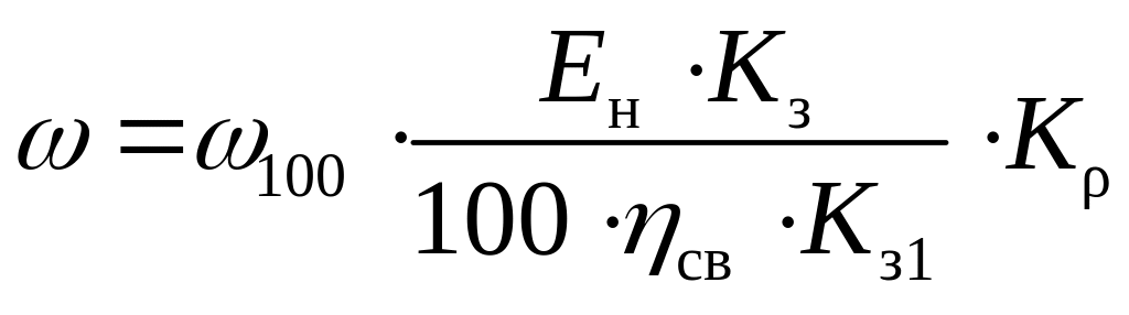 Таблицы 8 приложения приведены для условного КПД=100% (или в долях КПД=1). Расчетное значение удельной мощности для реально применяемых светильников определяется дополнительным делением табличного значения 100 на выраженный в долях единицы КПД светильников (св). Кроме того, необходимо учитывать разницу между коэффициентом запаса помещения принятым для расчета (Кз) по таблице 11 приложения и реальным значением коэффициента запаса в таблице удельных мощностей (Кз1):