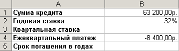 С3 ұяшығындағы тоқсандық ставканы өз алдына есептеңiз. 3. Үлестiң мерзiмiн есептеуi үшiн периодты тұрақты төлеулердi негiзгі және тұрақты проценттi ставкалық инвестициясы үшiн төлеудiң мерзiмдерiнiң жалпы санын қайтаратын Кпер жаңа қаржы функциясын пайдаланамыз. Кпер функциясының синтаксисi. КПЕР(ставка; плт; пс; бс; тип) ставка – мерзiмге байланысты проценттiк ставкы. Плт - әрбiр мерзiмде шығарылған төлем; бұл мәндер төлемдер мерзiмі бойынша өзгере алмайды. Төлеу әдетте пайыздар үшін негiзгi төлеуден тұрады және өзіне салықтар және жиындар қоспайды. Пс қазіргі мезетке келтірілген құны немесе қазіргі кезде болашақтағы төлемдерге тең жалпы сомма Келтiрiлген қазiргi мезет құнына немесе келешек төлемдердiң қатарына тең бағалы қазiргi мезет ортақ сома ит -. Бс - Келешектегі баға мәнің қажетет ету немесе сонғы төлемнен кейінгі қалдық сомма Егер Бс аргументі төмендетілсе , онда ол 0 ге тең болады Тип –төлем қай мезтте өткізілуі керектігін білдіретін 0 немесе 1 таңбалаушы сан. 4. Егер пайыздарды есептеп шығару жылдың соңында болса үлес мерзiмнi есептейік.Ол үшiн В5 ұяшығына =КПЕР(B3;;B2;B4) немесе =КПЕР(15%;;-75000;200000)формуласын енгіземіз.. осы жағдайда ПЛТ дәлелі төмендетілген, өйткенi ешқандай да қосымша үлестер өндiрiп алмайды. 5. Егер пайыздарды есептеп шығаруды тоқсандар бойынша өндiрiп алсақ С5 ұяшықта ұқсас түрмен үлес мерзiмiн есептеңiз. Осы жағдайда есептеудiң нәтижесiмен тоқсан саны болатынына көңiл аударыңыз.Сондықтан алған нәтижені 4ке бөлу керек. 6. Алған нәтижелерді салыстырыңыз және қорытынды жасаңыз.