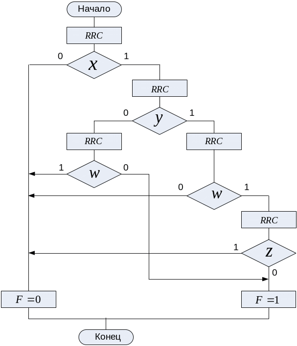 Рассмотрим пример построения блок-схемы алгоритма анализа булевой функции, которые зависит от четырех переменных – x, y, z, w: