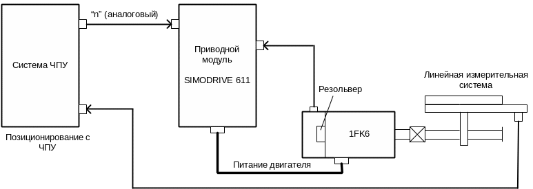 На рисунке 7.6 показан вариант построения привода с двигателем 1FK6 и аналоговым интерфейсом заданного значения Standard.