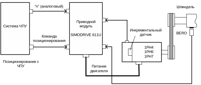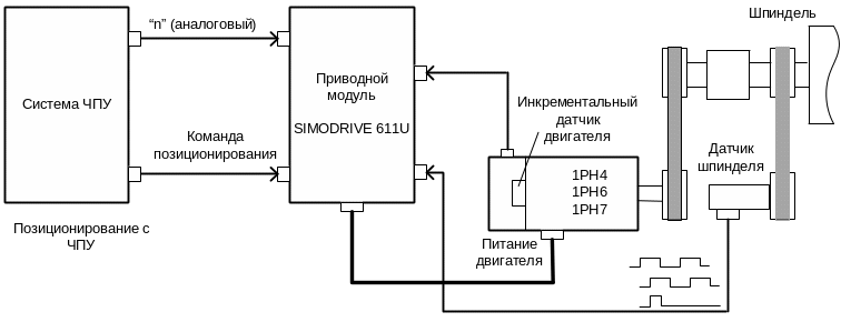Для прямой регистрации положения шпинделя применен инкрементальный датчик, который соединен со шпинделем посредством ременной передачи. При подаче команды позиционирования на плату управления SIMODRIVE 611U производится переключение на внутреннее управление положением по разнице заданного и фактического положения.