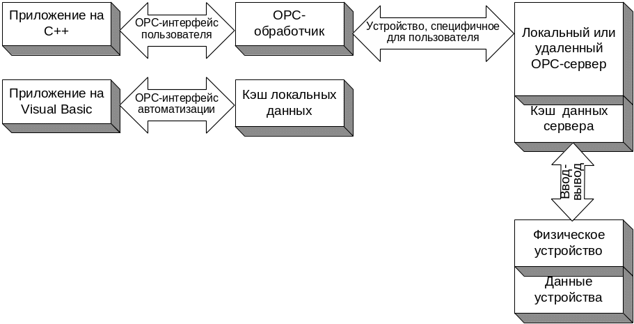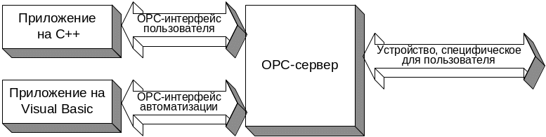 Таким образом, клиентское ОРС-приложение взаимодействует с ОРС-сервером через специфицированный разделяемый интерфейс и специальный интерфейс пользователя или интерфейс автоматизации. Эти интерфейсы решают проблему открытого управления, т.е. обеспечивают совместимость и интерактивность разнообразных локальных устройств.