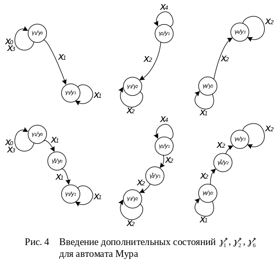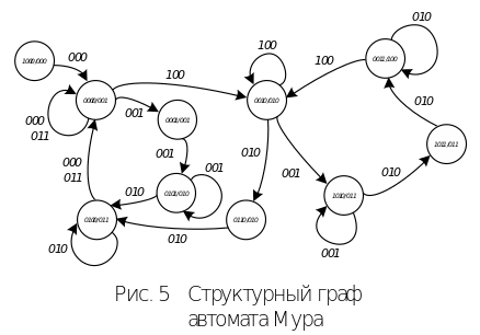 Структурный граф автомата Мура представлен на рис. 5. Все смежные вершины графа обозначены кодовыми комбинациями с кодовым расстоянием, равным единице.