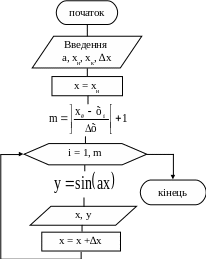 На схемі організації циклу з відомим числом повторень відображається алгоритм, в якому параметром циклу є змінна i, що змінюється від 1 до m, де m – кількість повторень циклу, що визначується по формулі: