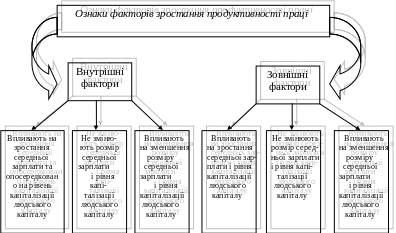 Рис. 4.8. Класифікаційні ознаки моделі факторів зростання продуктивності праці та їх вплив на середню заробітну плату і на рівень капіталізації людського капіталу