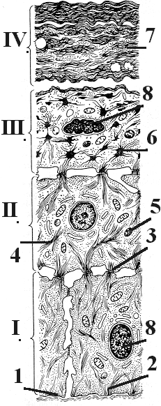 На ней показаны клетки каждого из 4-х слоёв эпидермиса "тонкой" кожи: I - базальный, II - шиповатый, III - зернистый, IV - роговой. |