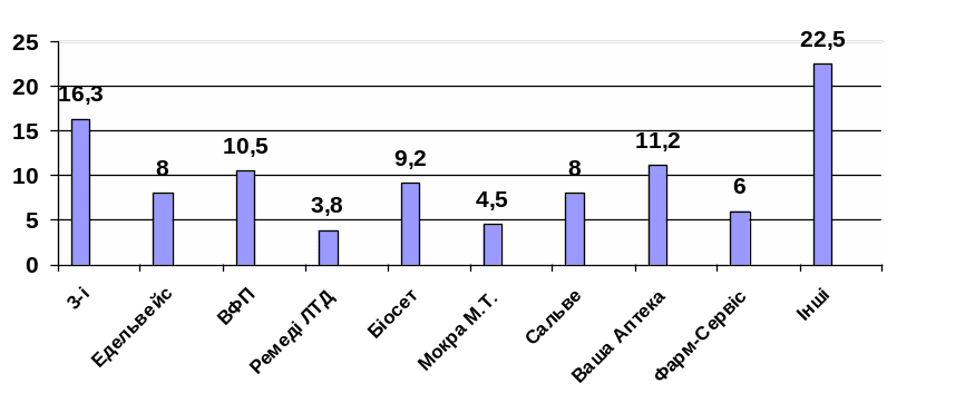 Мережа аптек ТзОВ „3-і” (с. Сокільники, Львівська обл.) – 16,3%;