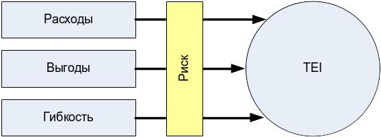 В модели TEI риски учитываются через их влияние на выгоды, затраты и гибкость. Надо заметить, что при процедуре количественной оценки рисков становятся ясными и пути их уменьшения, например, разделение больших проектов на ряд малых или закладывание в бюджет больших, но не изменяющихся расходов.