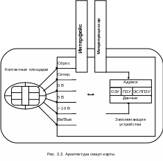 Карты с микропроцессором называют также интеллектуальными картами или смарт-картами (smart cards). Карты с микропроцессором представляют собой по сути микрокомпьютеры и содержат все соответствующие основные аппаратные компоненты: центральный процессор (ЦП), оперативное запоминающее устройство (ОЗУ), постоянное запоминающее устройство (ПЗУ) и электрически стираемое программируемое ПЗУ (ЭСППЗУ) (рис. 2.2).