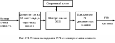 При первом варианте PIN генерируется криптографически из номера счета держателя карточки. Процесс генерации назначаемого PIN из номера счета показан на рис. 9.3 . Сначала номер счета клиента дополняется нулями или другой константой до 16 шестнадцатеричных цифр (8 байт). Затем получившиеся 8 байт шифруются по алгоритму DES с использованием секретного ключа. Из полученного шифртекста длиной 8 байт поочередно выделяют 4-битовые блоки, начиная с младшего байта. Если число, образуемое этими битами, меньше 10, то полученная цифра включается в PIN, иначе это значение не используется. Таким путем обрабатывают все 64 бита (8 байт). Если в результате обработки не удалось получить сразу требуемое количество десятичных цифр, то обращаются к неиспользованным 4-битовым блокам, из которых вычитают 10.