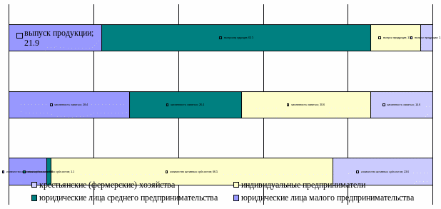 В январе-августе 2012 года по сравнению с соответствующим периодом 2011 года наблюдалось увеличение выпуска продукции (в сопоставимых ценах) субъектами МСП практически во всех областях. Так, этот индикатор увеличился на 0,1% и составил 4561,2 млрд. тенге, в том числе юридическими лицами малого предпринимательства – 998,6 млрд. тенге (21,9%), юридическими лицами среднего предпринимательства – 2896,1 млрд. тенге (63,5%), индивидуальными предпринимателями – 536,3 млрд. тенге (11,7%) и крестьянскими (фермерскими) хозяйствами – 130,1 млрд. тенге (2,9%) (таблица 3).
