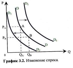 шее количество товара по каждой из возможных цен, то происходит уменьшение спроса, графически - сдвиг кривой влево (D1, D2).