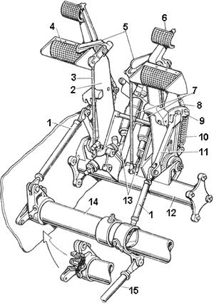 Качающиеся педали с нижним расположением оси вращения состоят из двух подножек 4, которые установлены на вертикальных рычагах 2, шарнирно закрепленных на кронштейне 12. Каждый рычаг связан тягами 1 с валом 14, к которому присоединяется тяга руля направления 15. Тяги 1 левой и правой педалей присоединяются к валу 14 по разные стороны от его оси вращения, что обеспечивает отклонение педалей в разные стороны.