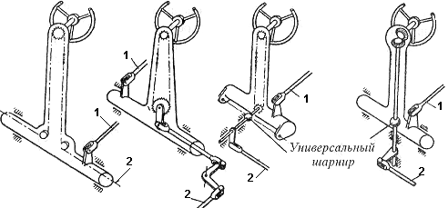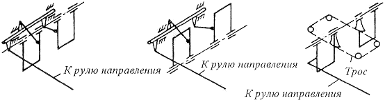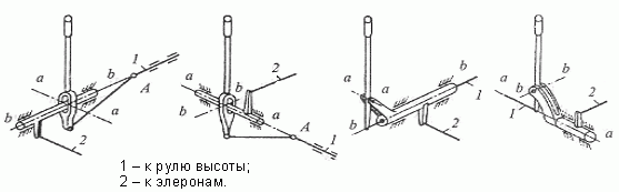 Показанные на этих схемах принципы обеспечения независимости отклонения элеронов и рулей высоты вполне очевидны и не требуют дополнительных пояснений. Ручка управления обычно используется на маневренных самолетах, обеспечивая простоту и высокую чувствительность управления, что очень важно для таких самолетов.