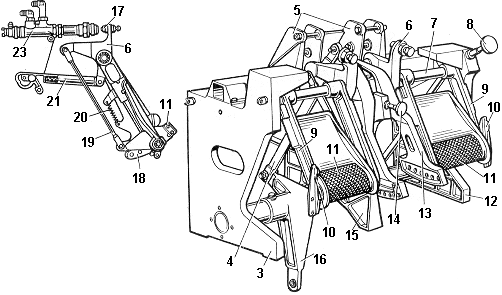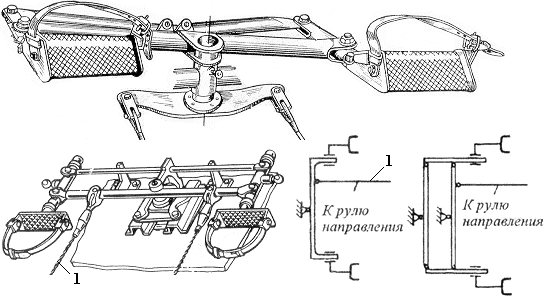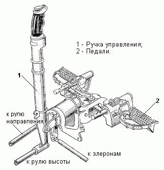 К основному горизонтальному рычагу присоединяется проводка управления 1 руля направления. Параллелограммный механизм обеспечивает поступательное движение педали и ноги летчика без их разворачивания. Для регулировки по росту подножки педалей переставляются относительно рычажного механизма и стопорятся специальными фиксаторами.