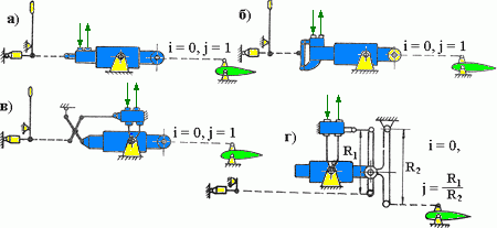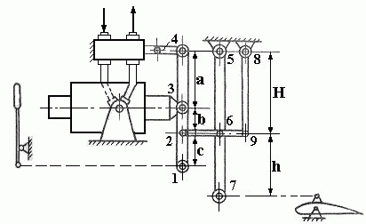 Смещая тягу 2 - 6 параллельно самой себе вверх или вниз, можно получать любые усилия на командном рычаге, не изменяя передачу по перемещениям, так как при таком переносе будет меняться лишь соотношение плеч b/Н, а суммы плеч качалок не изменяются.