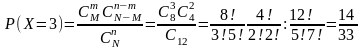Применяем формулу. Т.к. в данном случае N=12, М=8, n=5, m=3, то