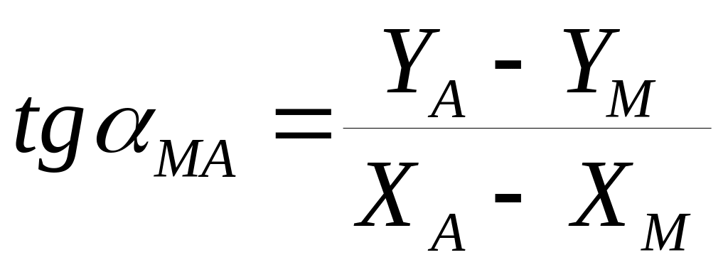 По известным координатам опорных пунктов M и N и точки A решением обратной геодезической задачи вычисляют дирекционные углы соответствующих направлений. При этом пользуются формулами: