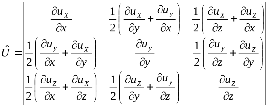 Демек, деформация ығысу векторының U( r) өрiсiмен сипатталады. Бiрақ жеке нүкте үшiн алынған ығысу векторы деформацияны сипаттай алмайды. Сонымен қатар қарастырылып отырған нүкте мен оған көршi нүктелер ығысу векторына (U) тең шамаға орын ауыстырса, онда да деформация байқалмайды. Әрбiр нүкте маңындағы ығысу векторының салыстырмалы өзгерiсi ғана деформацияны береді. Демек деформация векторлық өрістің өзгеру жылдамдығымен анықталады. Ол векторлық функция болып есептелінетін ығысу векторынан векторлық аргумент бойынша толық туынды алуға алып келеді, оны тензор –туындыны деп атаймыз: