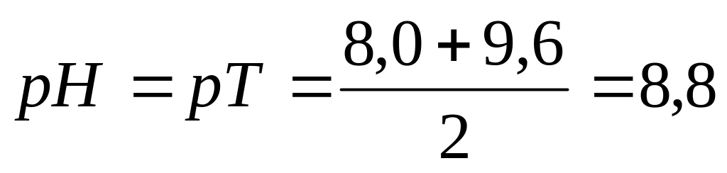 Выбираем подходящие индикаторы: феноловый красный (интервал перехода6,4-8,0); тимоловый синий (интервал перехода 8,0-9,6); фенолфталеин (интервал перехода8,0-9,6), поскольку интервалы перехода этих индикаторов лежат в пределах скачка кривой титрования.