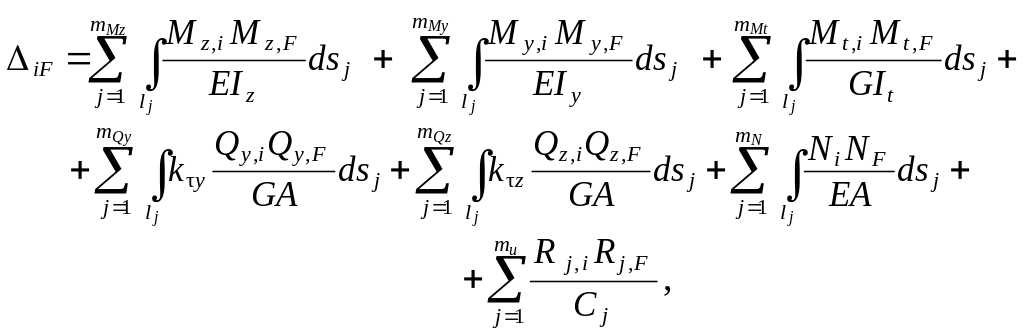В общем случае все величины в числителях и знаменателях подынтегральных выражений – функции от криволинейной ко-ординаты sj ( для прямого участка – xj ): Mz, i = Mz, i (sj), Mz, F = = Mz, F (sj), …, Qz, i = Qz, i (sj), Qz, F = Qz, F (sj), N i = N i (sj), N F = N F (sj),